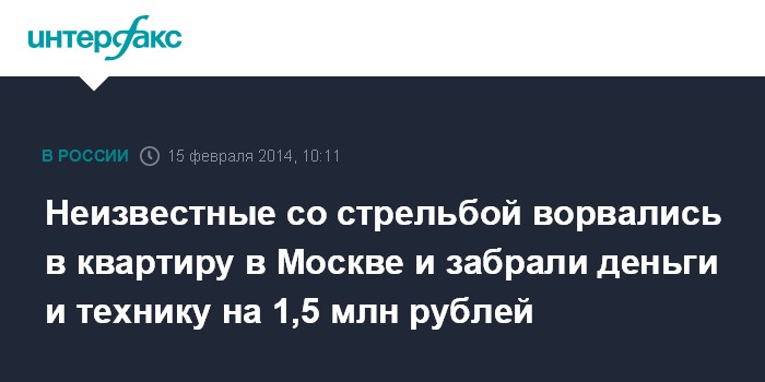 Москва. 15 февраля. INTERFAX.RU - Двое вооруженных пистолетом грабителей зашли в квартиру на западе Москвы и со стрельбой похитили деньги и технику на 1,5 млн рублей, сообщили "Интерфаксу" в субботу в пресс-службе ГУ МВД РФ по Москве.