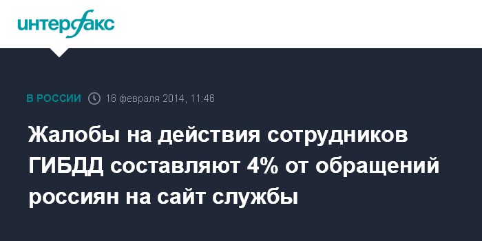 Москва. 16 февраля. INTERFAX.RU - Жалобы россиян на работу дорожной полиции составляют незначительную часть в общем потоке обращений в Госавтоинспекцию, сообщил начальник отдела Главного управления по обеспечению безопасности дорожного движения (ГУОБДД) МВД Алексей Кисляков. "В прошлом году в главк, в том числе посредством официального сайта службы, от граждан поступило около 16 тысяч обращений, касающихся деятельности Госавтоинспекции. В 645 (чуть более 4%) из них содержались жалобы на действия сотрудников ГИБДД", - сказал А.Кисляков "Интерфаксу".