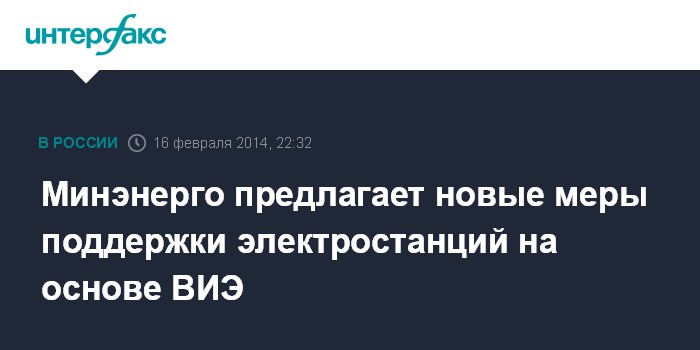Москва. 16 февраля. INTERFAX.RU - Минэнерго РФ предлагает новые меры поддержки проектов строительства электростанций на основе возобновляемых источников энергии (ВИЭ), следует из "дорожной карты" первого этапа реализации Энергостратегии-2035, с проектом которой ознакомился "Интерфакс".