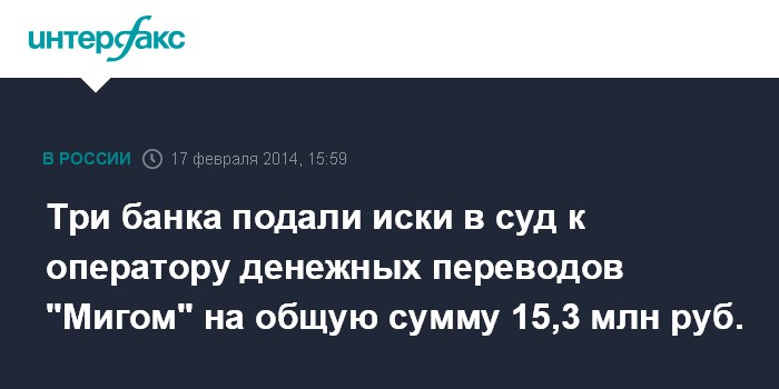 Три банка подали иски в суд к оператору денежных переводов "Мигом" на общую сумму 15,3 млн руб.