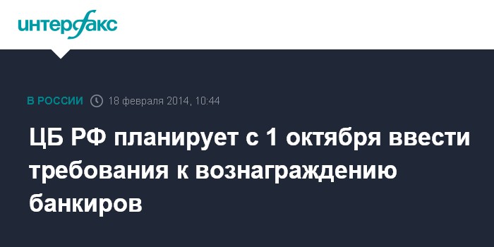 Москва. 18 февраля. ИНТЕРФАКС-АФИ - ЦБ РФ планирует с 1 октября 2014 года ввести требования к вознаграждению банкиров, сообщил директор департамента банковского регулирования ЦБ Василий Поздышев на пресс-конференции в центральном офисе "Интерфакса" в Москве во вторник.