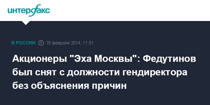 Москва. 18 февраля. INTERFAX.RU - Акционерам "Эха Москвы" не объяснили причин снятия с должности генерального директора радиостанции Юрия Федутинова, заявил представитель акционера Александр Березин.
