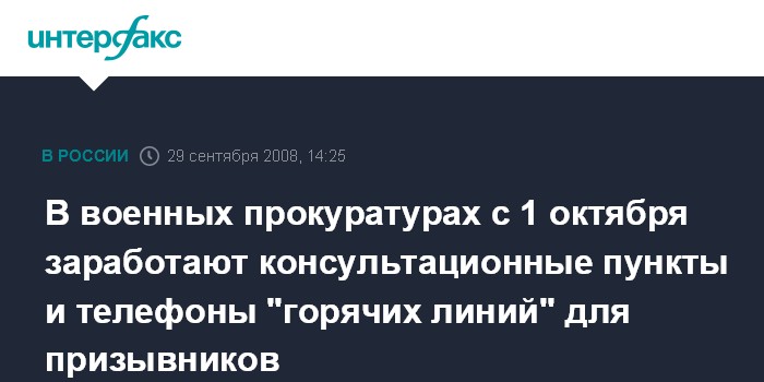 "В связи с началом очередного призыва на военную службу в военных прокуратурах с 1 октября возобновляют работу консультационные пункты и телефоны "горячих линий", - сообщили "Интерфаксу" в понедельник в Главной военной прокуратуре (ГВП) РФ.
