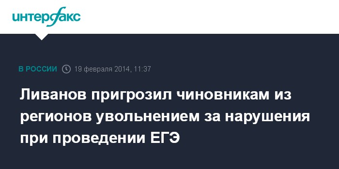 Москва. 19 февраля. INTERFAX.RU - Глава Минобрнауки РФ Дмитрий Ливанов предложил увольнять руководителей управлений образования в регионах за нарушение процедуры проведения единого госэкзамена.