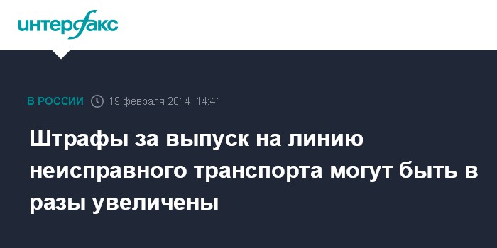 Москва. 19 февраля. INTERFAX.RU - Штрафы для должностных лиц, по вине которых в рейс выйдет неисправный автобус или иное транспортное средство, могут увеличиться в ближайшее время в 8 - 10 раз.