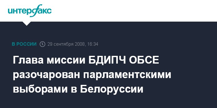 Москва. 29 сентября. INTERFAX.RU - Руководитель миссии наблюдателей Бюро по демократическим институтам и правам человека ОБСЕ Герт-Хинрих Аренс выразил разочарование состоявшимися в Белоруссии парламентскими выборами.