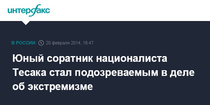 Москва. 20 февраля. INTERFAX.RU - Несовершеннолетний сподвижник националиста Максима (Тесака) Марцинкевича подозревается в совершении преступления экстремистской направленности.