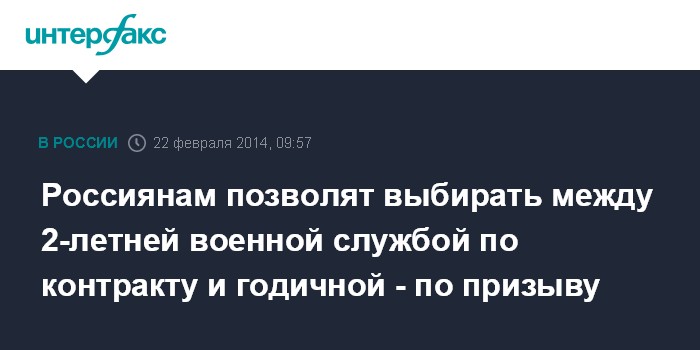 Москва. 22 февраля. INTERFAX.RU - Правительство РФ внесло в Госдуму законопроект, согласно которому граждане смогут выбирать, будут ли они служить в рядах Вооруженных сил год по призыву или два по контракту.