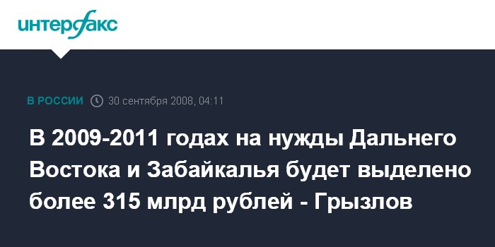В 2009-2011 годах на нужды Дальнего Востока и Забайкалья будет выделено более 315 млрд рублей - Грызлов