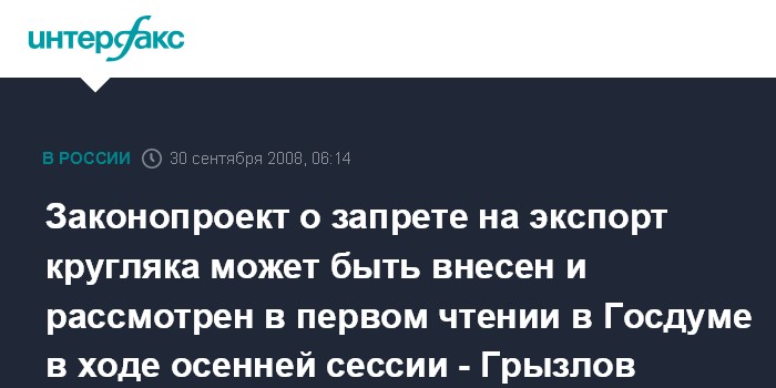 Хабаровск. 30 сентября. ИНТЕРФАКС - Председатель Госдумы РФ Борис Грызлов считает, что законопроект о полном запрете экспорта круглого леса может быть внесен и рассмотрен в первом чтении в Госдуме в ходе осенней сессии.