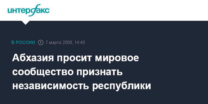 Сухуми. 7 марта. INTERFAX.RU - Парламент Абхазии обратился к международному сообществу с просьбой о признании независимости самопровозглашенной республики, сообщает агентство "Интерфакс". На внеочередном заседании в пятницу парламент принял текст обращения к ООН, ЕС, ОБСЕ, всем странам мира с просьбой признать независимость страны и установить с ней межгосударственные отношения. Отдельное обращение, в котором выражена просьба содействовать международному признанию Республики Абхазия, направлено в Госдуму и Совет Федерации РФ.