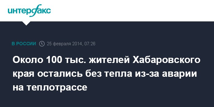 Хабаровск. 25 февраля. ИНТЕРФАКС - ДАЛЬНИЙ ВОСТОК - В Хабаровском крае из-за крупной аварии на тепломагистрали без тепла остались 980 жилых домов, около 50 школ и 13 лечебных учреждений, сообщает Дальневосточный региональный центр МЧС.