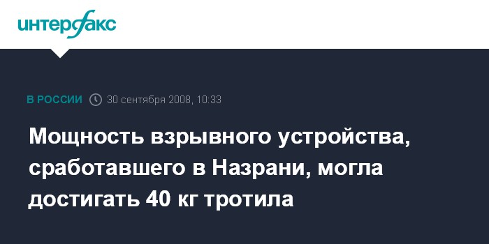 Москва. 30 сентября. INTERFAX.RU - По предварительным данным, мощность взрывного устройства, которое было приведено в действие во вторник в Назрани на пути следования кортежа главы МВД Ингушетии, составляла до 40 кг тротила, сообщил "Интерфаксу" прокурор Ингушетии Юрий Турыгин.