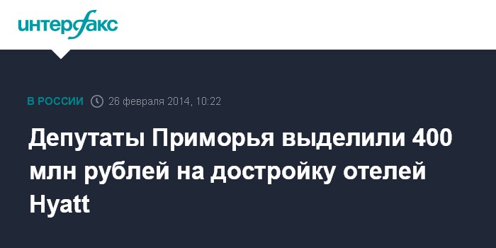 Москва. 26 февраля. INTERFAX.RU - Депутаты Приморья в среду на очередном заседании внесли изменения в законопроект о бюджете региона на предстоящий период, в том числе выделили 400 млн рублей компании-заказчику на достройку во Владивостоке двух пятизвездных отелей Hyatt.