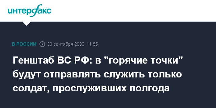 Москва. 30 сентября. INTERFAX.RU - Закон позволяет направлять в "горячие точки" солдат, прослуживших не менее полугода и получивших военную специальность, сообщил во вторник журналистам заместитель начальника Генштаба ВС РФ генерал-полковник Василий Смирнов.