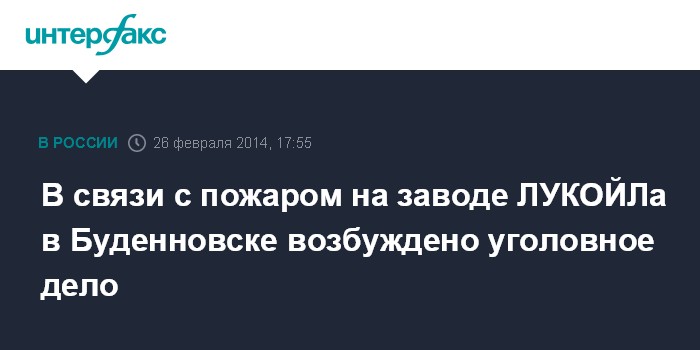 Пятигорск. 26 февраля. INTERFAX.RU - Уголовное дело возбуждено по факту возгорания на ООО "Ставролен" (100% дочернее предприятие НК "ЛУКОЙЛ") в городе Буденновске Ставропольского края, сообщило краевое следственное управление СКР в среду.