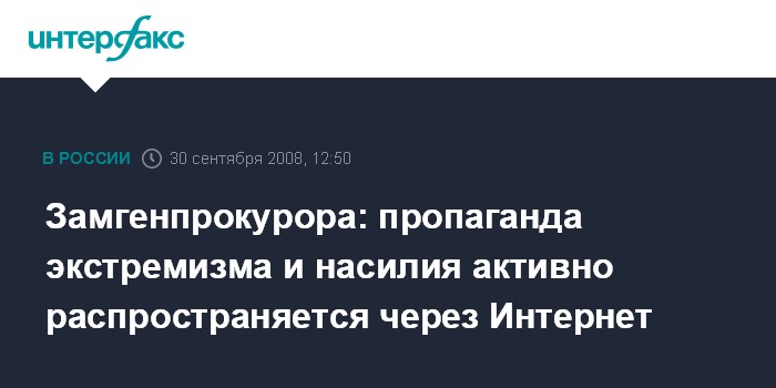 Москва. 30 сентября. INTERFAX.RU - Интернет-ресурсы сегодня активно используются для пропаганды экстремизма и насилия, заявил замгенпрокурора РФ Виктор Гринь.