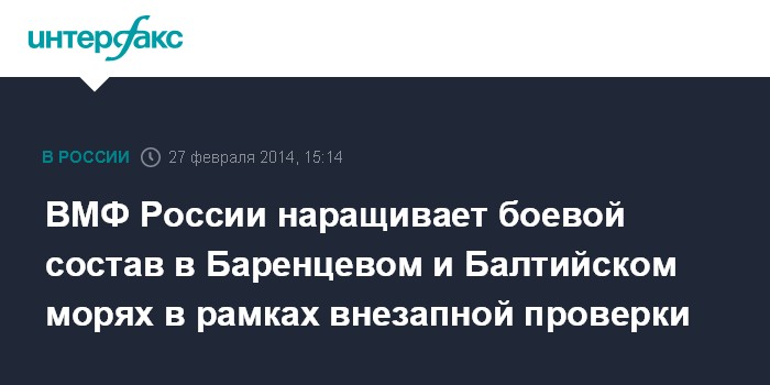 Москва. 27 февраля. INTERFAX.RU - Северный и Балтийский флоты в рамках внезапной проверки боевой готовности наращивают боевой состав в акваториях Баренцева и Балтийского морей, сообщает управление пресс-службы и информации Минобороны РФ.