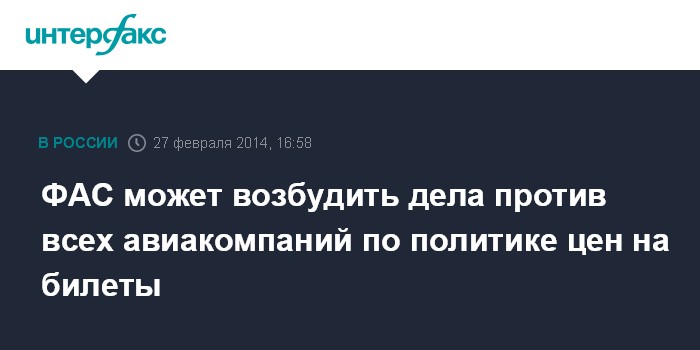 Москва. 27 февраля. INTERFAX.RU - Федеральная антимонопольная служба (ФАС) не исключает возбуждения дел против авиакомпаний по политике цен на билеты, заявил журналистам руководитель ведомства Игорь Артемьев в четверг в Москве.