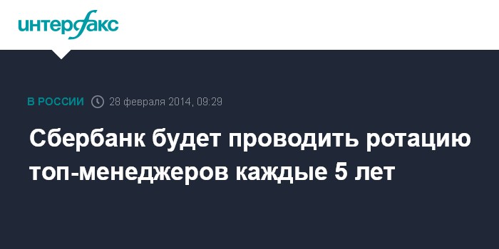 Москва. 28 февраля. INTERFAX.RU - Сбербанк планирует проводить ротацию топ-менеджеров каждые 5 лет, сообщает в пятницу газета "Коммерсантъ".