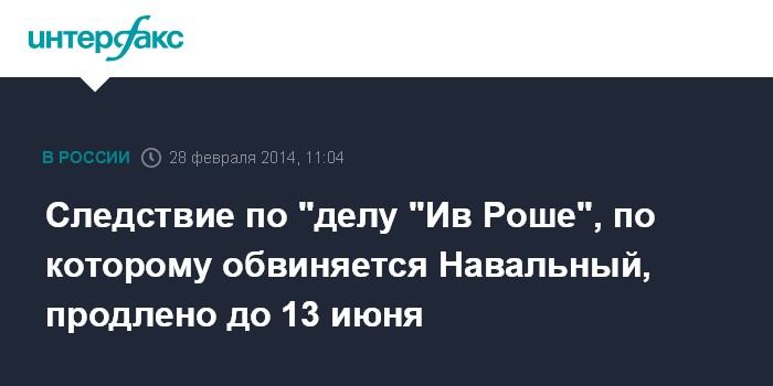 Следствие по "делу "Ив Роше", по которому обвиняется Навальный, продлено до 13 июня