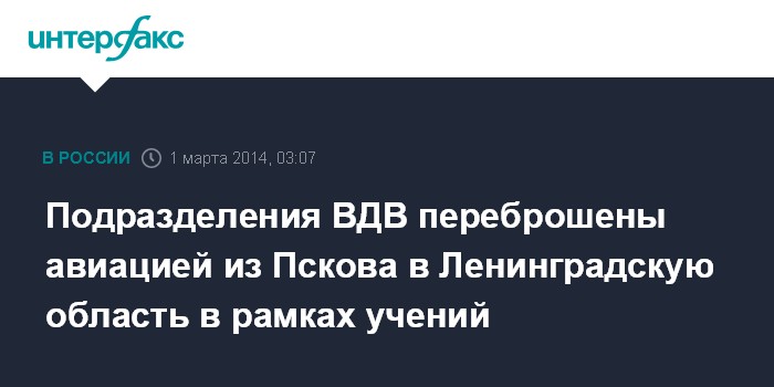 Москва. 1 марта. ИНТЕРФАКС - В рамках внезапной проверки боевой готовности войск, дислоцируемых на территории Западного и Центрального военных округов, подразделения 76 гвардейской воздушно-десантной дивизии совершили погрузку личного состава, военной техники и вооружения в самолеты военно-транспортной авиации и вертолеты на военных аэродромах в Псковской области и были переброшены на аэродромы Ленинградской области.
