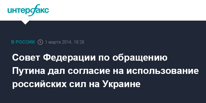 Москва. 1 марта. INTERFAX.RU - Совет Федерации принял постановление об использовании Вооруженных сил РФ на территории Украины на основании обращения президента РФ и исходя из интересов безопасности граждан, в том числе российских, и воинского контингента России, дислоцирующегося на территории Украины.