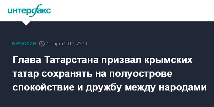 Казань. 1 марта. INTERFAX.RU - Президент Татарстана Рустам Минниханов выразил беспокойство тем, что происходит на территории Украине, и попросил крымских татар не допустить разобщения народов в Крыму.