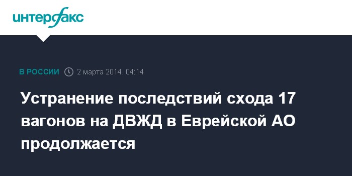 Москва. 2 марта. INTERFAX.RU - На протяжении всей прошедшей ночи в Облученском районе Еврейской АО спасатели и железнодорожники устраняли последствия схода 17 вагонов, в ближайшее время ремонтники обещают открыть для проезда один из путей, сообщает Дальневосточный региональный центр (ДВРЦ) МЧС.