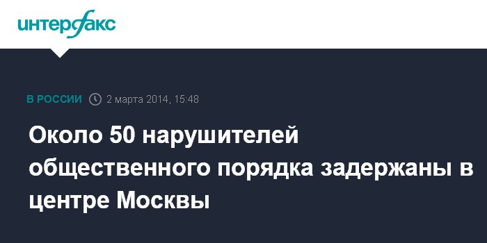 Москва. 2 марта. INTERFAX.RU - В центре Москвы задержано около 50 человек за нарушение общественного порядка, сообщили "Интерфаксу" в пресс-службе ГУ МВД РФ по Москве. "В центре города в воскресенье собралось около 150 человек, включая большое количество представителей СМИ и блогеров", - отметили в пресс-службе главка.