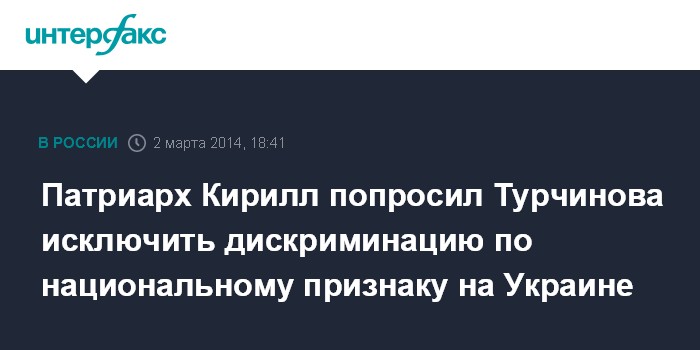 Москва. 2 марта. INTERFAX.RU - Патриарх Московский и всея Руси Кирилл в воскресенье пообщался по телефону с и.о. президента Украины Александром Турчиновым. Со своей стороны Святейший патриарх Кирилл выразил глубокую озабоченность в связи с последними событиями в стране", - сообщает патриаршая пресс-служба.
