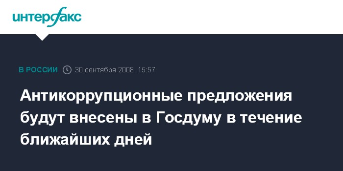 Москва. 30 сентября. INTERFAX.RU - Пакет антикоррупционных законов, рассмотренных на заседании Совета при президенте по противодействию коррупции, поступит в Госдуму в ближайшие два дня.