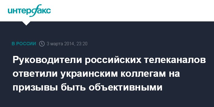 Москва. 3 марта. INTERFAX.RU - Руководители главных российских федеральных телеканалов ответили украинским коллегам на их призывы быть объективными при освещении событий на Украине.