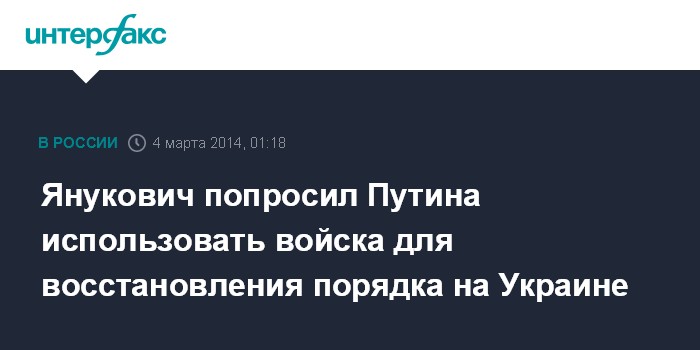 Москва. 4 марта. INTERFAX.RU - Постоянный представитель РФ в ООН Виталий Чуркин заявил, что Виктор Янукович призвал президента России Владимира Путина задействовать Вооруженные силы РФ для восстановления порядка на территории Украины.