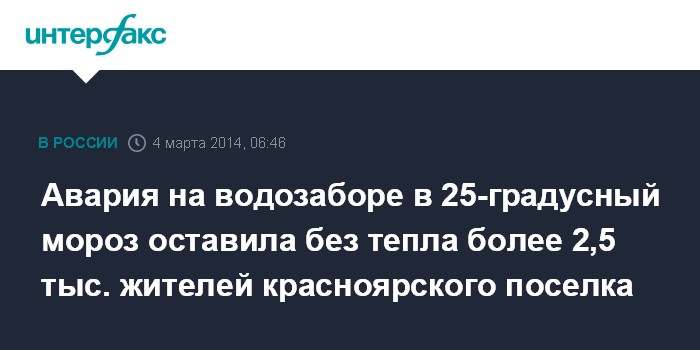 Москва. 4 марта. INTERFAX.RU - Поломка насоса на водозаборе в поселке Таежный Красноярского края оставила без воды и тепла 2,6 тыс. человек, а также социальные объекты, сообщает пресс-служба ГУ МЧС России по Красноярскому краю во вторник.