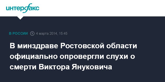 "В период с 28 февраля по сегодняшний день, пациент Виктор Янукович ни в государственные, ни в муниципальные учреждений Ростовской области за медицинской помощью не обращался и на лечении, соответственно, не находился. Поэтому и умереть в наших лечебных учреждениях он тоже не мог", - сказала министр Татьяна Быковская.