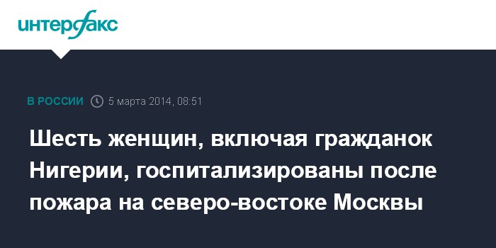 Москва. 5 марта. INTERFAX.RU - Шесть женщин, включая трех гражданок Нигерии, пострадали в результате пожара в квартире на северо-востоке столицы, сообщили в среду в пресс-службе ГУ МВД РФ по Москве.