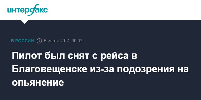 Москва. 5 марта. INTERFAX.RU - Командира экипажа авиарейса Благовещенск - Москва медики не допустили к полету, заподозрив у него признаки алкогольного опьянения, сообщил агентству "Интерфакс-Дальний Восток" директор благовещенского аэропорта Валерий Шлегель.