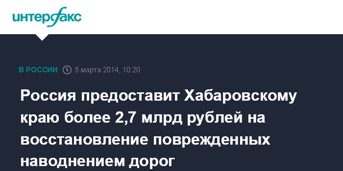 Москва. 5 марта. INTERFAX.RU - Хабаровский край получит более 2,7 млрд рублей из федерального бюджета на восстановление дорог, поврежденных в результате крупномасштабного наводнения 2013 года, сообщила пресс-служба правительства региона.