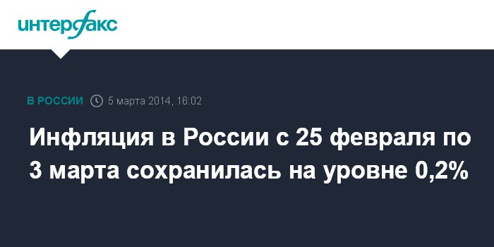 Москва. 5 марта. INTERFAX.RU - Инфляция в России с 25 февраля по 3 марта 2014 года составила 0,2%, сообщил в среду Росстат.