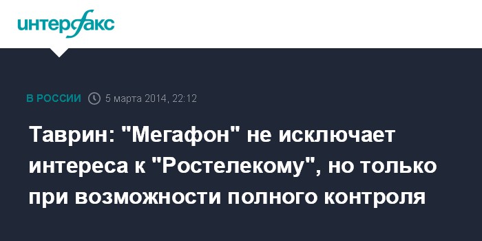 Таврин: "Мегафон" не исключает интереса к "Ростелекому", но только при возможности полного контроля