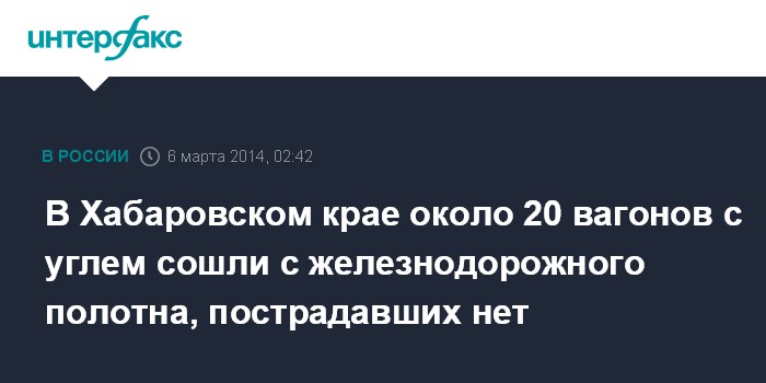 Москва. 6 марта. INTERFAX.RU - В Хабаровском крае на перегоне Кунгурское Комсомольского района в ночь на четверг сошли 19 вагонов с углем грузового железнодорожного состава, сообщает пресс-служба ГУ МЧС по региону в четверг.