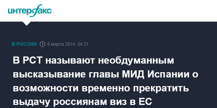 Москва. 6 марта. INTERFAX.RU - Российские туроператоры называют необдуманным заявление главы МИД Испании о возможности временного прекращения выдачи виз россиянам в качестве санкций против России в случае эскалации напряженности на Украине.