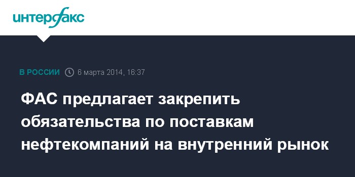 Москва. 6 марта. INTERFAX.RU - Федеральная антимонопольная служба (ФАС) предлагает закрепить обязательства по поставкам нефтекомпаний на внутренний рынок в законе, заявил замглавы ведомства Анатолий Голомолзин журналистам в четверг в Москве.