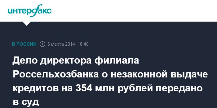 Дело директора филиала Россельхозбанка о незаконной выдаче кредитов на 354 млн рублей передано в суд