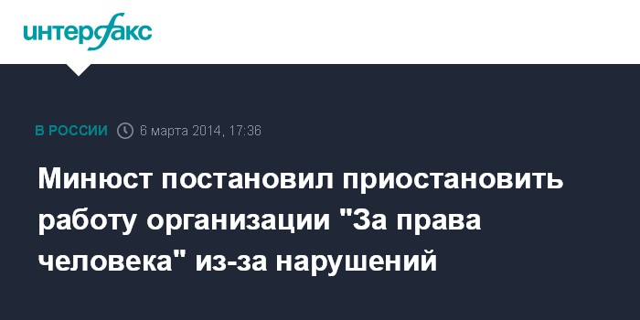 Москва. 6 марта. INTERFAX.RU - Деятельность организации "За права человека" приостановлена до 10 августа из-за неустраненных нарушений, подтвердили в пресс-службе Минюста России.