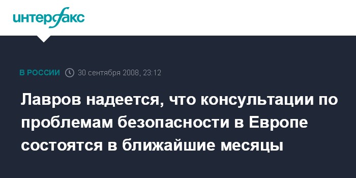 Москва. 30 сентября. ИНТЕРФАКС - Глава МИД РФ Сергей Лавров рассчитывает, что в ближайшие месяцы начнутся международные консультации по проблемам системы безопасности на европейском континенте.