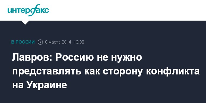 Москва. 8 марта. INTERFAX.RU - Россия призывает своих партнеров не рассматривать ее как одну из сторон конфликта на Украине, заявил глава МИД РФ Сергей Лавров. "Мы готовы продолжать диалог при понимании, что диалог должен быть честным, партнерским, без попыток выставить нас чуть ли не как сторону конфликта", - сказал он в субботу на пресс-конференции в Москве.
