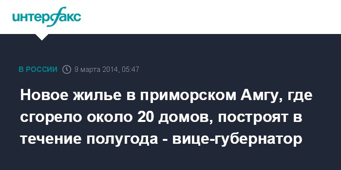Владивосток. 9 марта. ИНТЕРФАКС - ДАЛЬНИЙ ВОСТОК - После пожара в приморском селе Амгу, где от огня серьезно пострадало около 20 домов, создана специальная комиссия, которая займется вопросами строительства нового жилья для погорельцев.