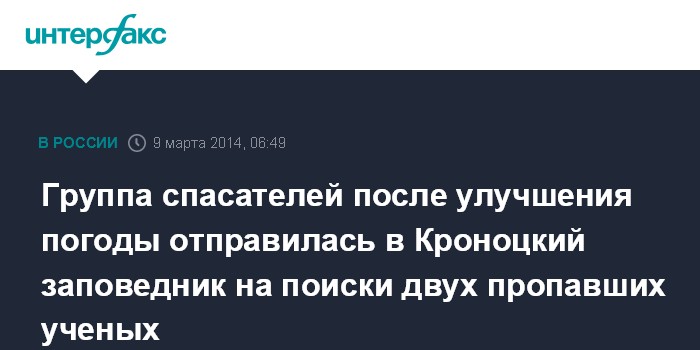 Владивосток. 9 марта. ИНТЕРФАКС - ДАЛЬНИЙ ВОСТОК - Прекращение снежной пурги на Камчатке позволила группе спасателей отправиться в Кроноцкий заповедник, где 5 марта пропали двое ученых, сообщает Дальневосточный региональный центр МЧС.